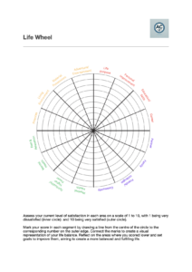 A tool to help identify issues to focus on for life coaching clients. Fill the wheel in between scores 1 – not satisfied (inside) or 10 satisfied (outer ring).