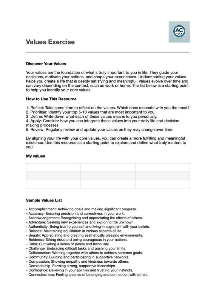 Values Exercise And List